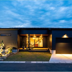 海辺にある平屋住宅は、ガルバリウム鋼板と塗り壁を組み合わせた外観が印象的で、広々としたウッドデッキが室内と庭をゆるやかにつなぎます。