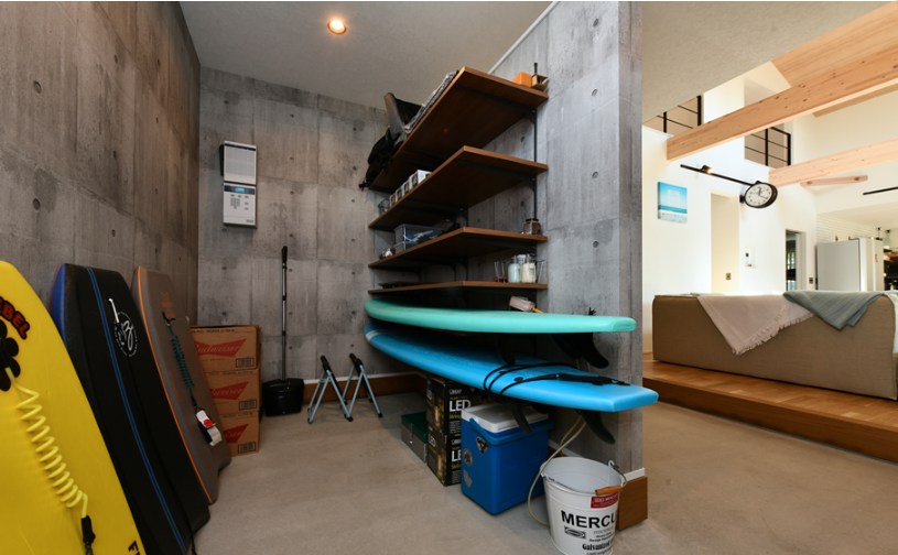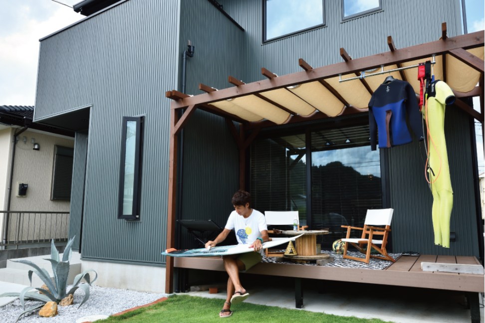 視線をやわらかく遮るフェンスや、バーベキュー用品・サーフボードをたっぷり収納できる玄関収納など、実用性にもこだわっています。