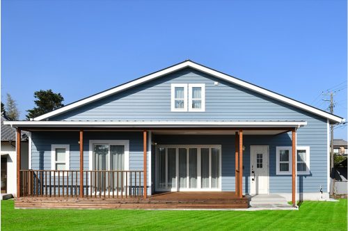 外壁や木目の自然な色合いと調和する爽やかな色味が、屋外空間全体に軽やかな印象を与えています。