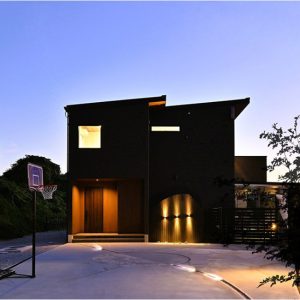 直線的なフォルムにウォールライトを組み合わせることで、昼とは異なる表情を見せ、夜には重厚感とモダンさが際立つファサードに仕上がっています。