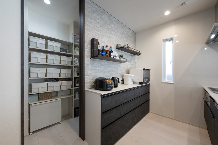 ファミリークローゼットで上着を脱いで洗面室で手を洗いリビングへ…とういうアクションがスムーズな帰宅動線。“いまの生活で使うものを見やすく・片付けしやすく”と位置づけをハッキリさせたパントリーなどの収納スペース。そのどれもが日々の暮らしを豊かに、軽やかにしています。