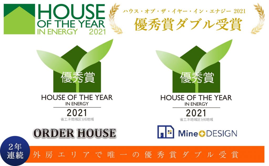 2022年03月27日 2年連続受賞!ハウス・オブ・ザ・イヤー2021年 優秀賞ダブル受賞 このたび高い住宅性能と省エネ住宅の普及などに対して評価を受け、注文住宅(ORDER HOUSE)と提案型規格住宅(Mine+DESIGN)で優秀賞をダブル受賞(外房エリアでは唯一!)しました。これも皆様のおかげと、心より感謝申し上げます。