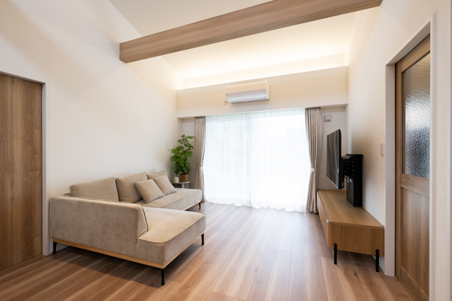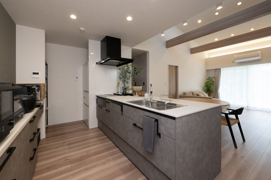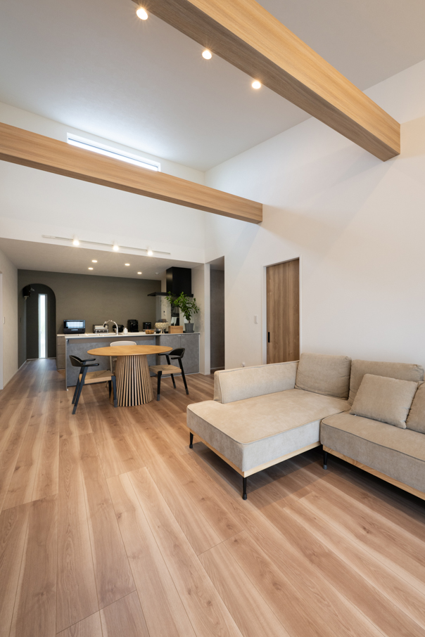 リビングは勾配天井+見せ梁で開放感を。キッチンとキッチン背面の壁など、室内もグレー+木目を中心に色数を抑え、ナチュラルで穏やかな空間に仕上がりました。