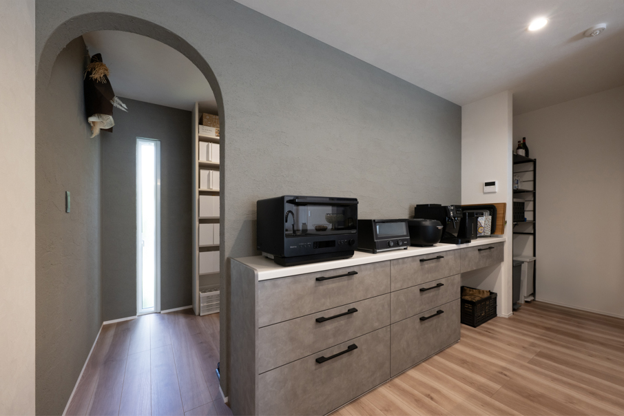 アーチ開口の大型パントリーは大人ふたりが入っても余裕で動ける広さ。食品類のほか、買い置きした日用品やシーズンオフの寝具も収納できるようになっています。