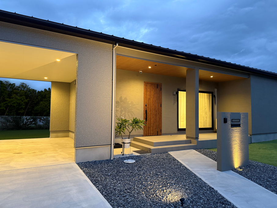 グレーのサイディングと塗り壁、そして軒天の木目が美しく調和する、端正なフォルムの平屋ガレージハウス。素材の質感を活かしたモダンな佇まいが、街並みに静かに存在感を放ちます。