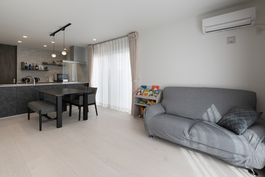 室内はあたたかくナチュラルな色合いをベースにグレーの濃淡を効かせて。やさしい光に包まれた空間は、住む人に安らぎをもたらします。