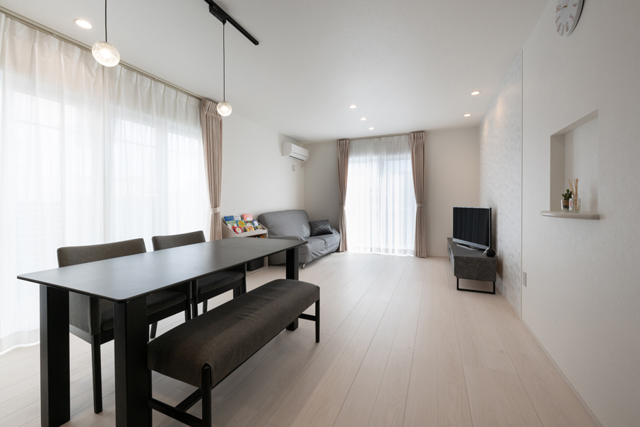 オーナーが選んだ「Mine+DESIGN(マインプラスデザイン)」は、ご家族が必要とするものをベースに欲しいもの・暮らしを愉しむものをプラスしていくスタイル。開放感と安らぎを感じられる空間で、ご家族で過ごす毎日を大切にされています。