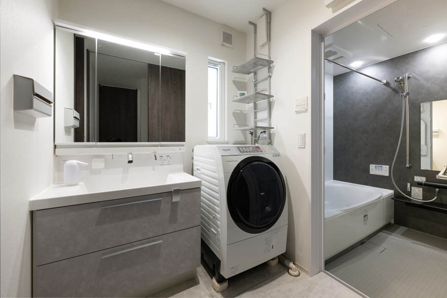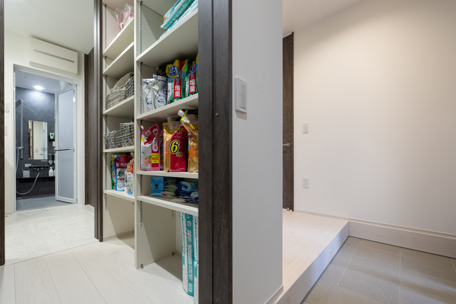 ファミリークローゼットで上着を脱いで洗面室で手を洗いリビングへ…とういうアクションがスムーズな帰宅動線。“いまの生活で使うものを見やすく・片付けしやすく”と位置づけをハッキリさせたパントリーなどの収納スペース。そのどれもが日々の暮らしを豊かに、軽やかにしています。