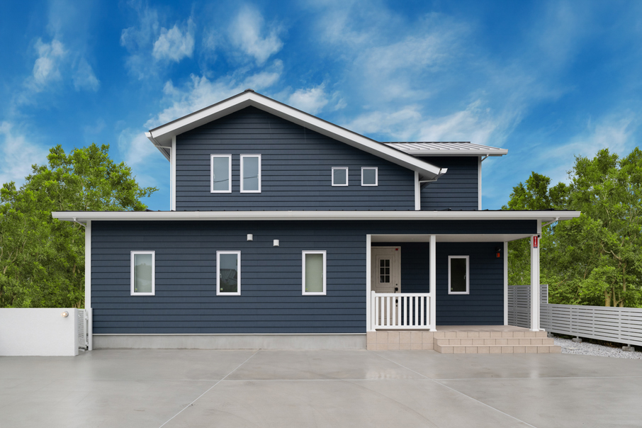 深いネイビーのラップサイディングに白いトリムが映えるアメリカンハウスは、近くの海岸まで徒歩数分という立地。海風がそよぐ静かな森の中に佇む企業の保養施設です。