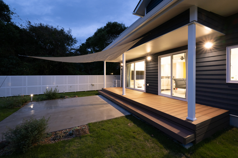 デッキ前に配置されたドライガーデンはライトアップにより立体感が際立ち、海外リゾート地のような印象に。ネイビーの外壁と優しい光が混じり合い、ここにしかない夜の景色が広がります。