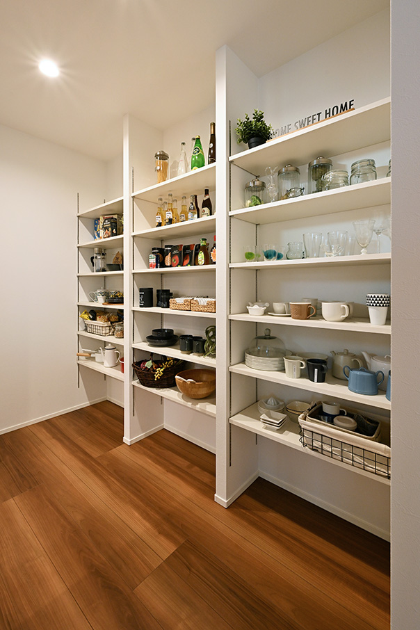 キッチンには備え付けのオープンタイプの見せる収納と、キッチン・リビング両方からアプローチできる大容量パントリー。優れた動線で家事効率もアップします。