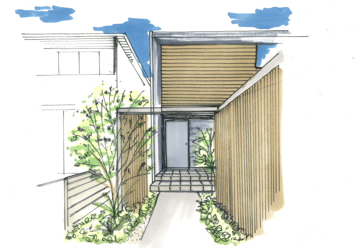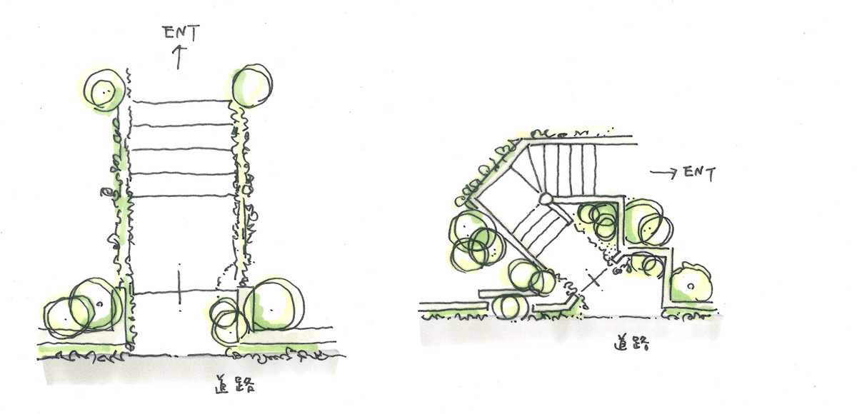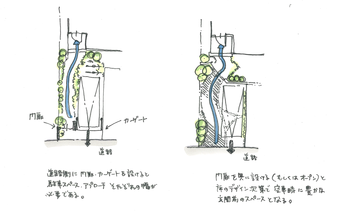 このような場合はアプローチ空間に奥行きとゆとりを感じさせる工夫が必要です。