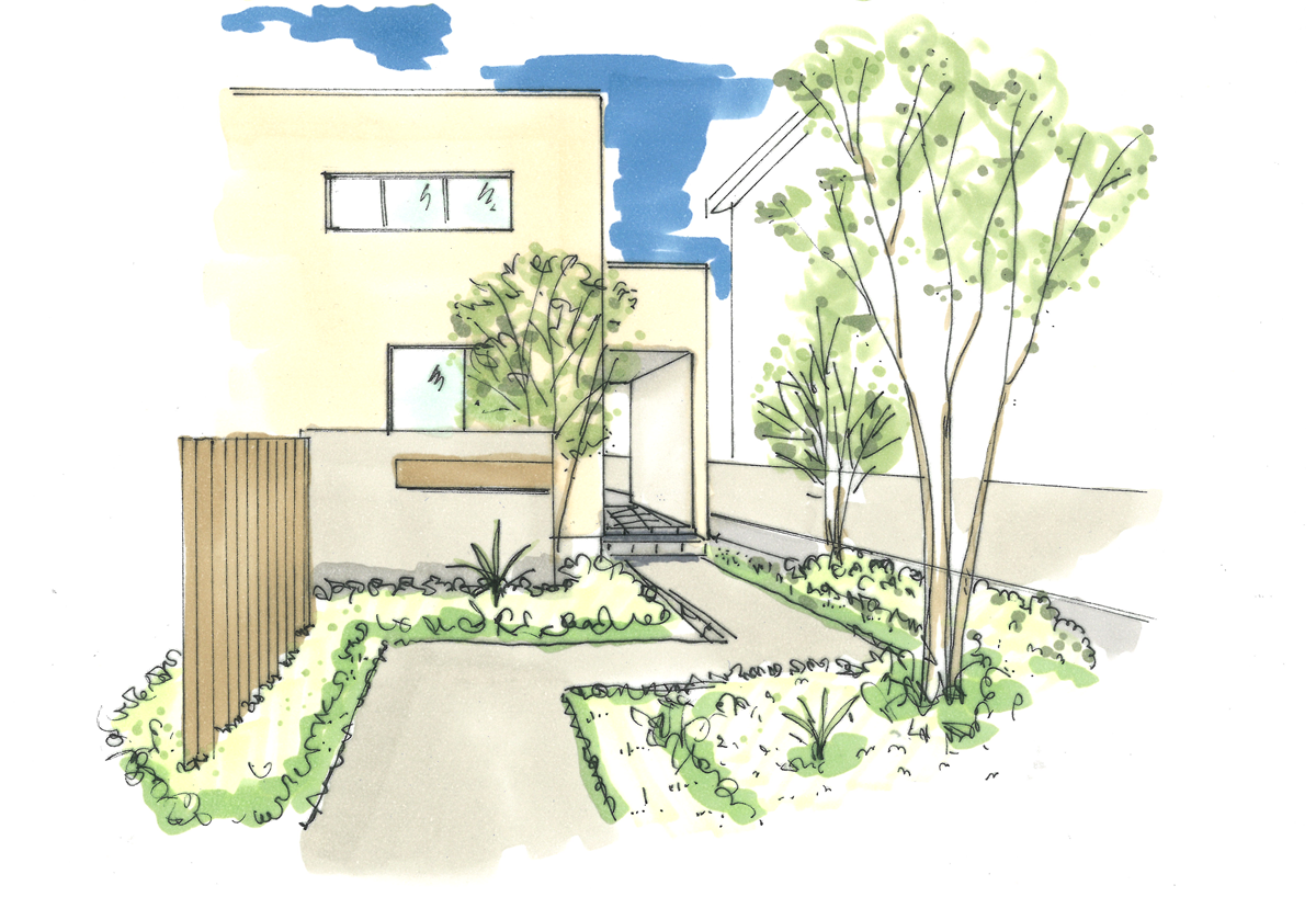 樹木には、フォーカルポイント(視線のポイント)となり玄関ドアへ視線を集中させない効果もあります。