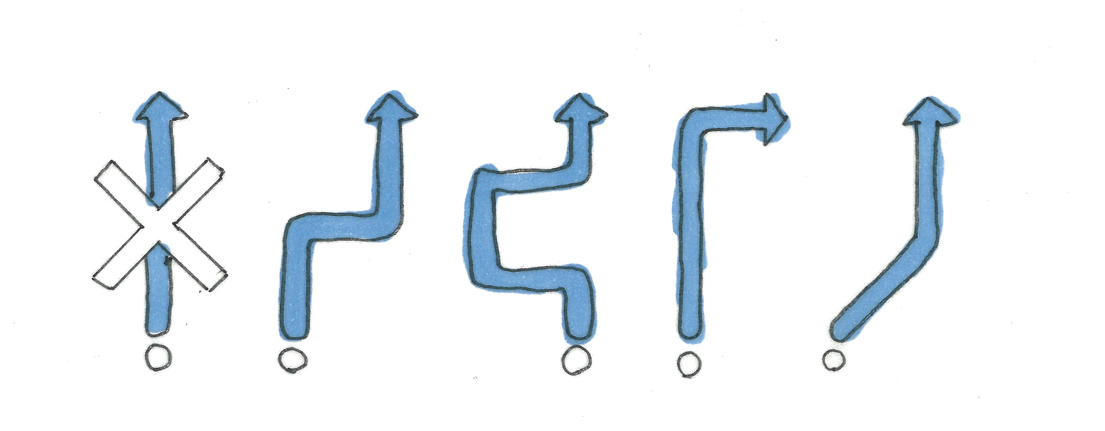 玄関までの距離に余裕がない場合でも下記のように玄関までの間にクッションスペースを作る工夫をしましょう。 見通しが遮られるとともに景色に変化が生まれ空間に奥行き感が生まれます。 ※アプローチの入り口と玄関を正対させない工夫が必要。
