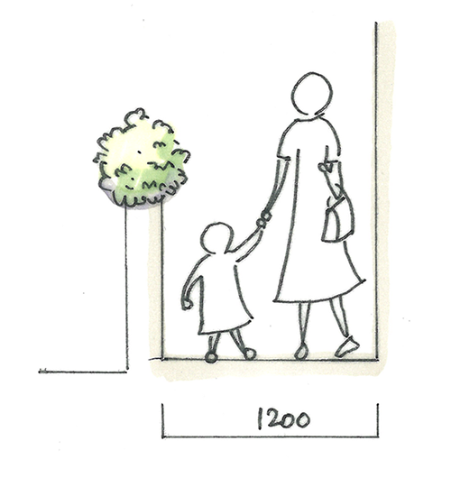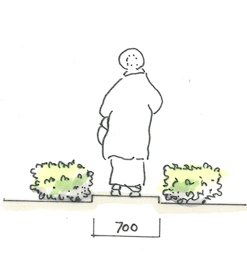 さらに、樹木などのグリーンをいれると直線的な印象が薄れ、やわらかな動きのある空間をつくることができます。
