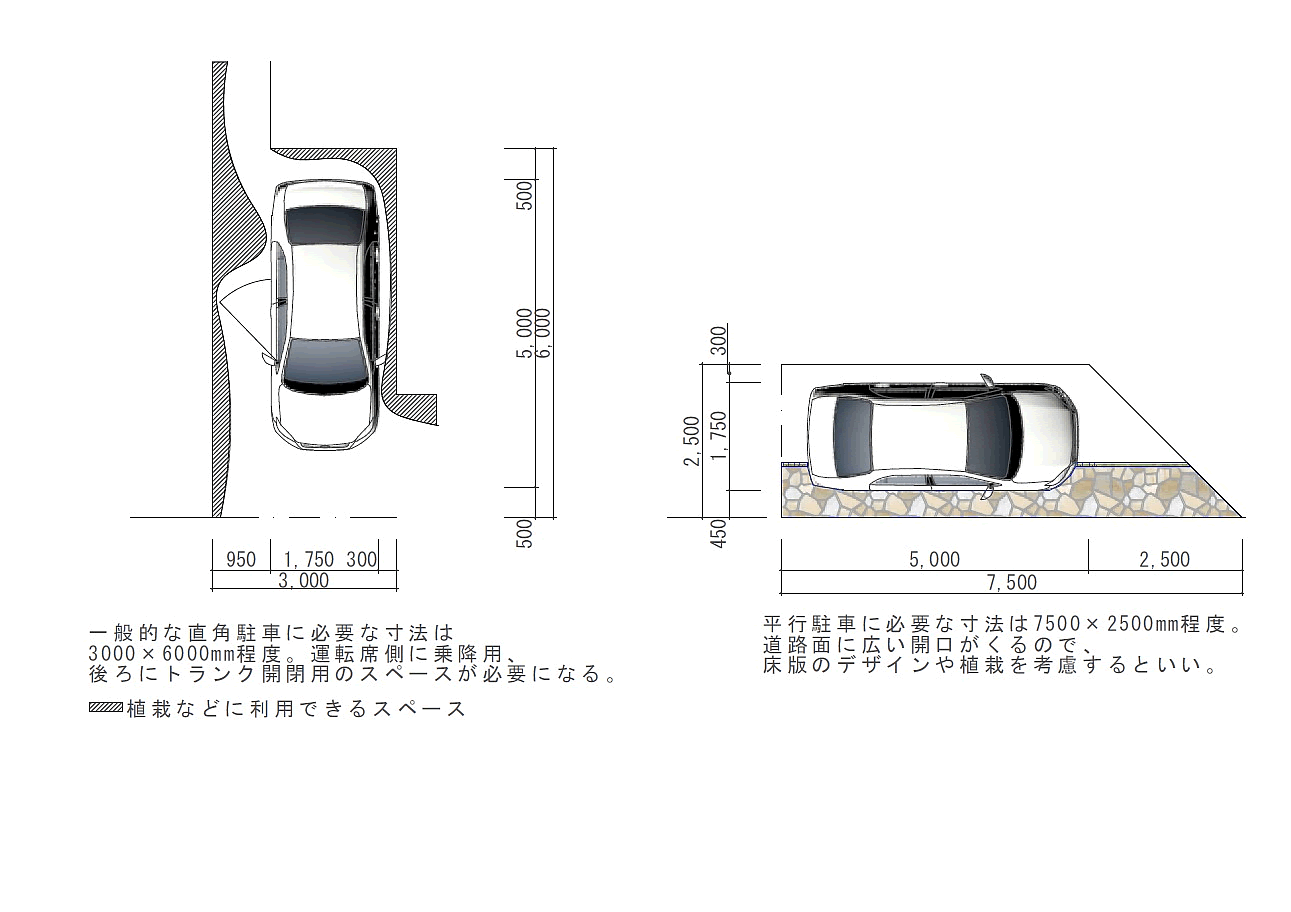 普通車の寸法は一般に1750×4500~5000mm程度として駐車スペースの検討を行います。 乗り降りに必要なスペースとトランクからの荷物の出し入れに必要なスペースも 検討しなくてはいけません。