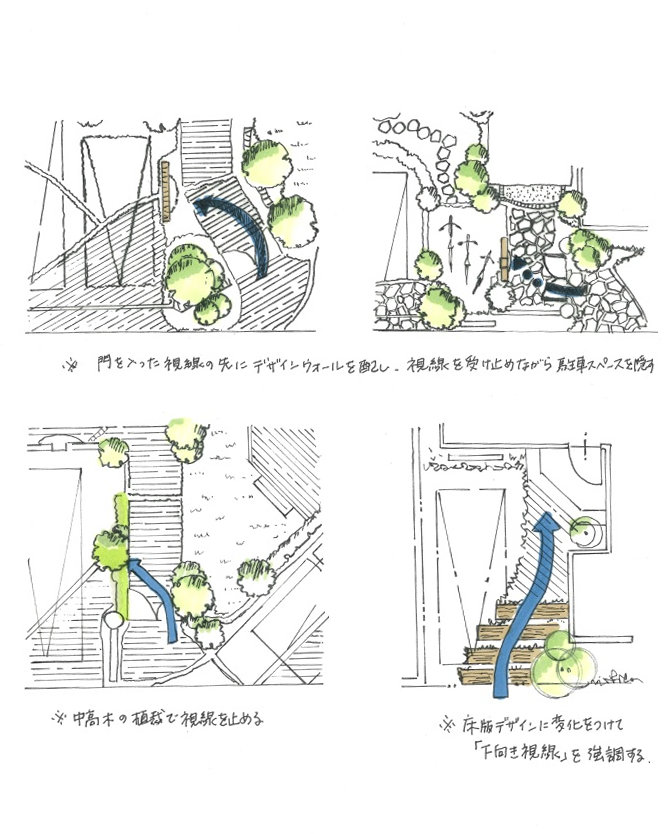 斜め駐車や動線方向のコントロールなどで車を隠す工夫があるといいと思います。